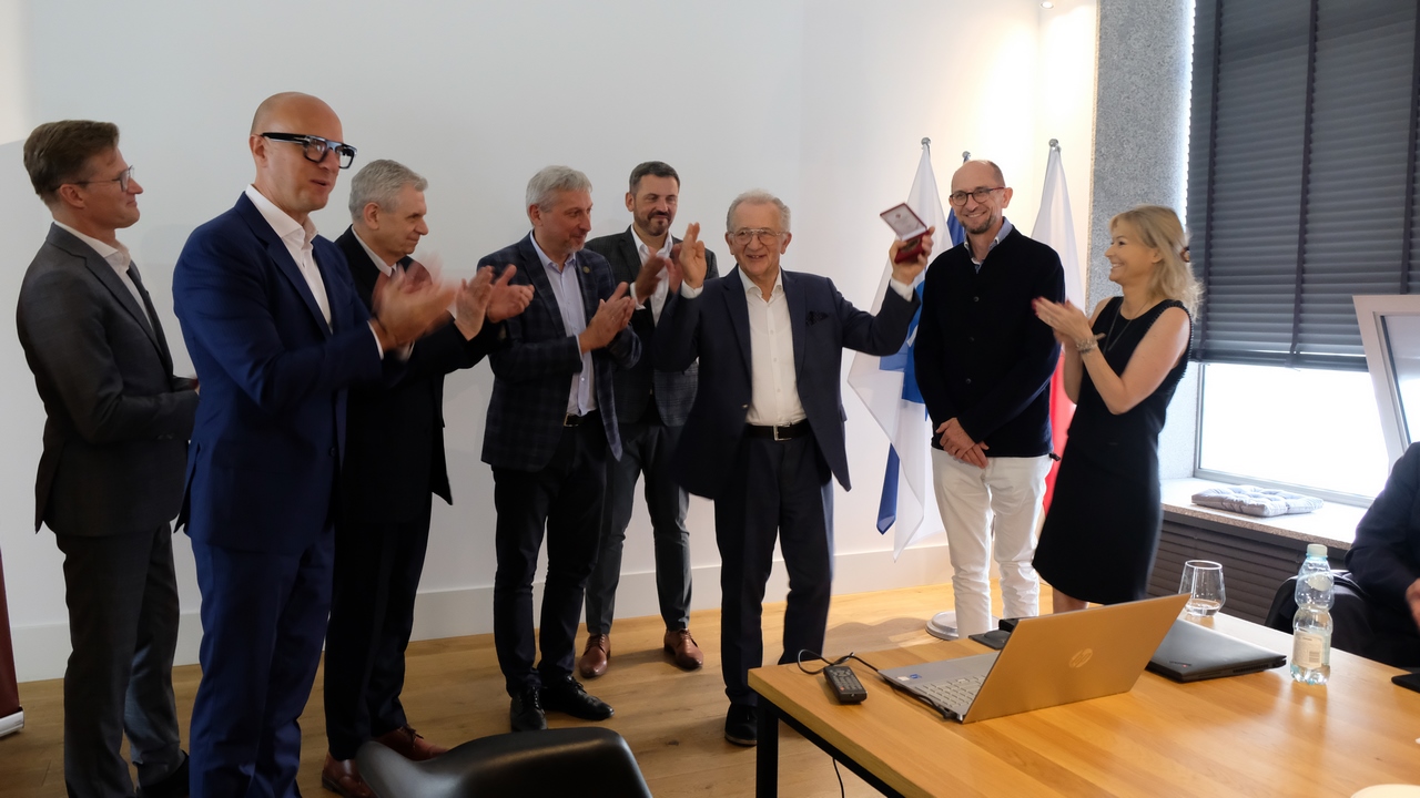 Członkowie zespołu organizującego Jubileusz (A. Slosarska, K. Kozłowski, A. Kozłowski, R. Hordyński) wręczyli okolicznościowy medal prof. Modelskiemu